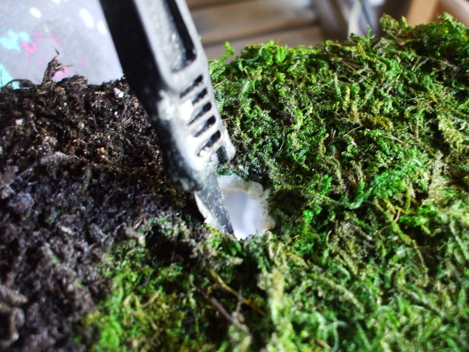 Next I layer down glue and cover it with the mat of mossy stuff. I let it dry, used spray glue and put fine dirt from outside on it.