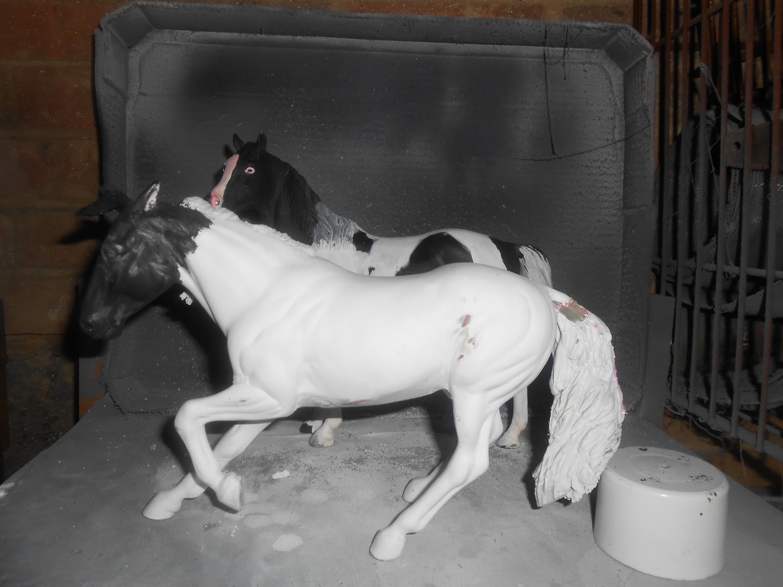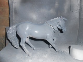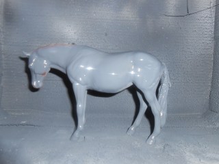 Reining horse. I got him at a yard sale (the best place to find bodies!) and chopped of his hair mane and tail, then sculpted a new one. He will be painted eventually. No idea though about his color….