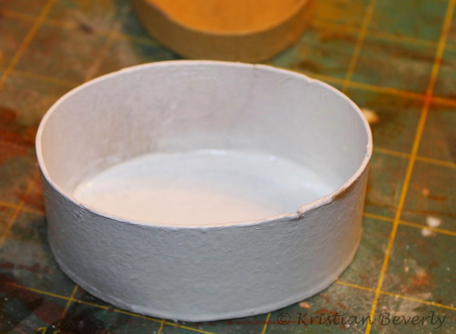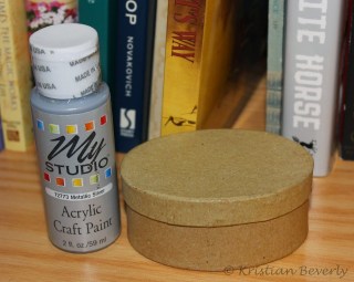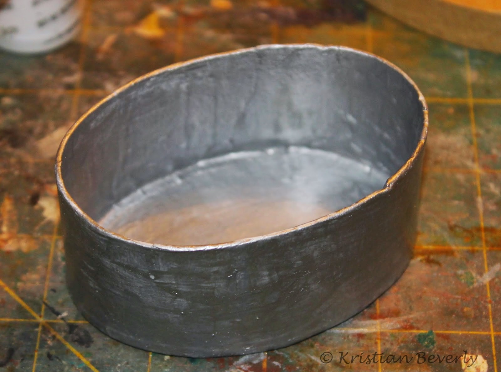 First you need an oval brown (paper mache I believe) box. You don’t need the lid and you can find the boxes at AcMoore. You will also need silver metallic paint.