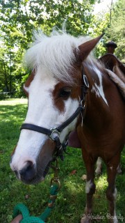 Last week I was asked if I would be interested in helping at a pony ride in Middletown. I said yes, so that’s what I did this morning. The pony ride was one of many activities offered to kids who brought their report cards with them. The big draw was the giving away of mountain bikes, but kids still meandered over to ride one of the two horses brought. I was in charge of the cute pony named Sweet Pea The other horse was a QH named Dolly. It was the first time for some of the kids to sit on a horse so Sweet Pea did a great job being gentle.
