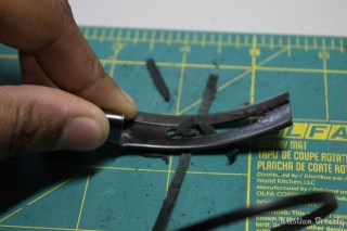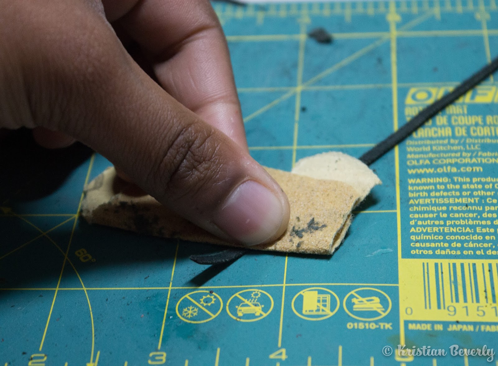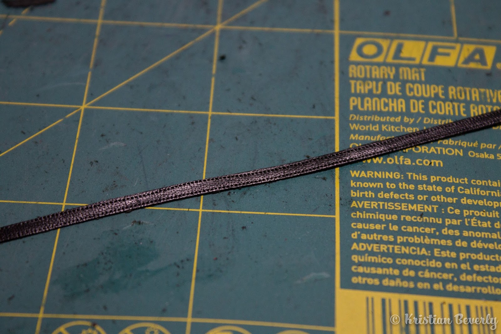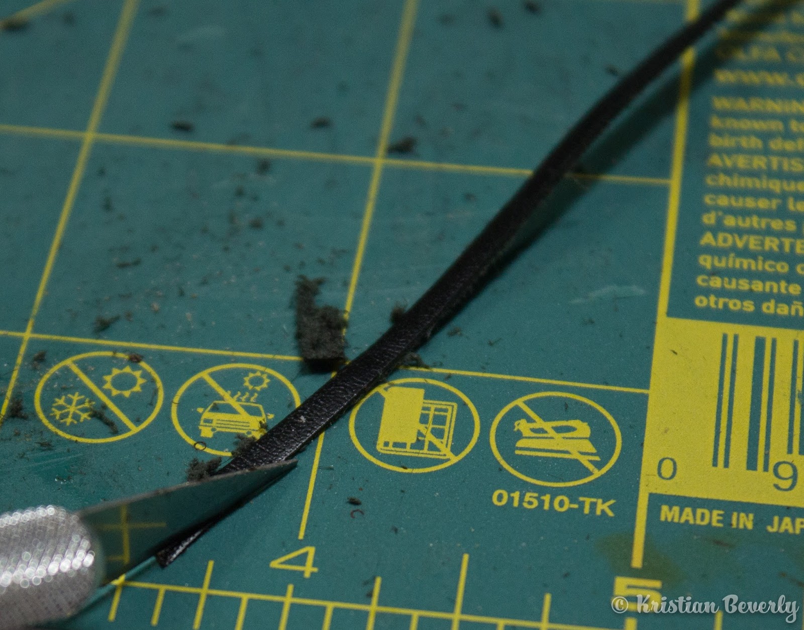 Pull out your X-acto knife and cut away any fuzzy bits along the side of the leather. The nice thing about using the skiving tool is that it usually leaves the leather pretty smooth after thinning it. But you still want to be sure that there aren’t any loose fuzzy pieces hanging out along the side.