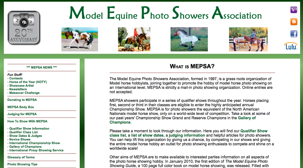 MEPSA or Model Equine Photo Showers Assocation is a long standing photo showing association. You physically print and send your photos to the judge. You pay a fee to show and at the end of the showing year there’s a championship show. There are also contests that you can enter throughout the year (tack/props/writing) where you can win cool prizes.