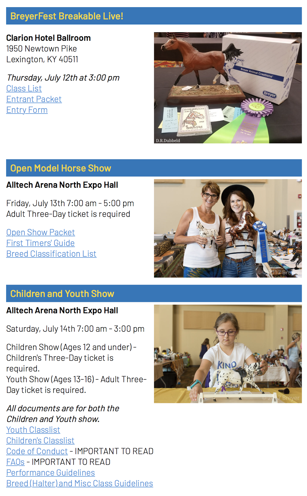 There are three Breyerfest Live shows : Breakables, Children/Youth, and Live. They’re unique to Breyerfest and different from really any other model horse show you’ll enter. I’m placing them separate from NAMHSA because they have unique rules.