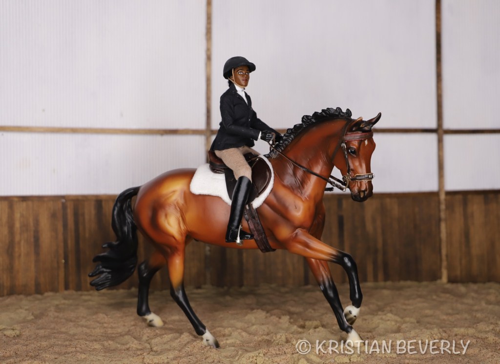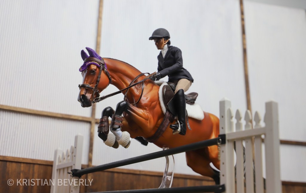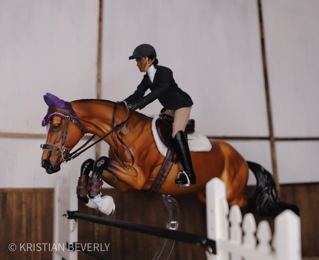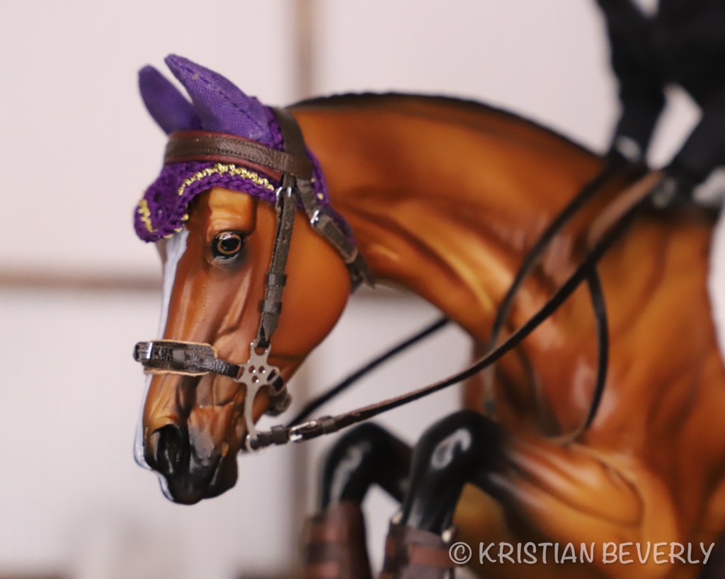 I still need to design my barn signs, but I really wanted to try out my arena. I bought a Voyeur that I want to repaint for NaMoPaiMo, but I really wanted to play with a jumping model. I also have a bunch of tack that I haven’t played with recently, so I broke out the ear bonnets and magnetic boots.
