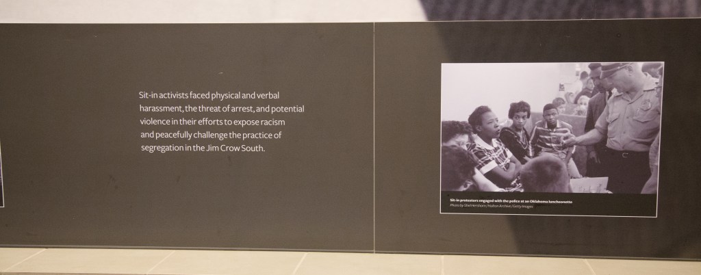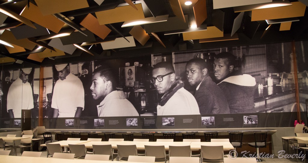 Stepping into the restaurant solidified that everyone should experience this museum. If you physically visit, splurge on the food. I bought fried chicken, collard greens, and corn bread. Fish isn’t my thing, but the one my mom bought nearly made me cave and try it. The dining hall had a large dedication to the sit-in protests.