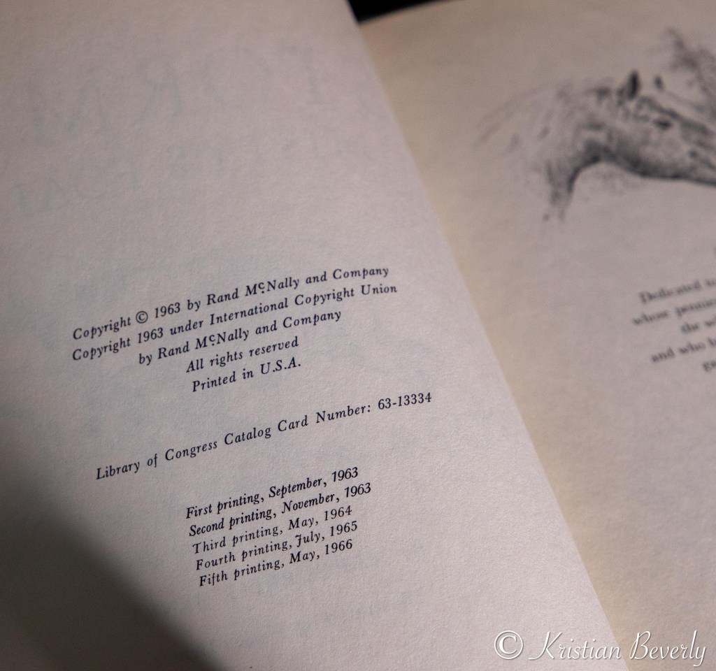 Stormy, Misty’s Foal, was published in 1963. The original artwork has Misty and Stormy’s real markings. This was my first hardback. It has the original dust jacket, but it’s price clipped. It looks exactly like the first printing, and in some ways this one is in the better condition. But the copyright page signifies it’s a fifth printing and came out in 1966, or three years after it was first published.