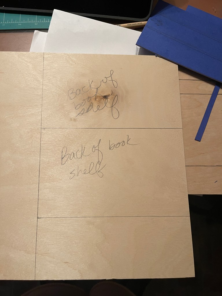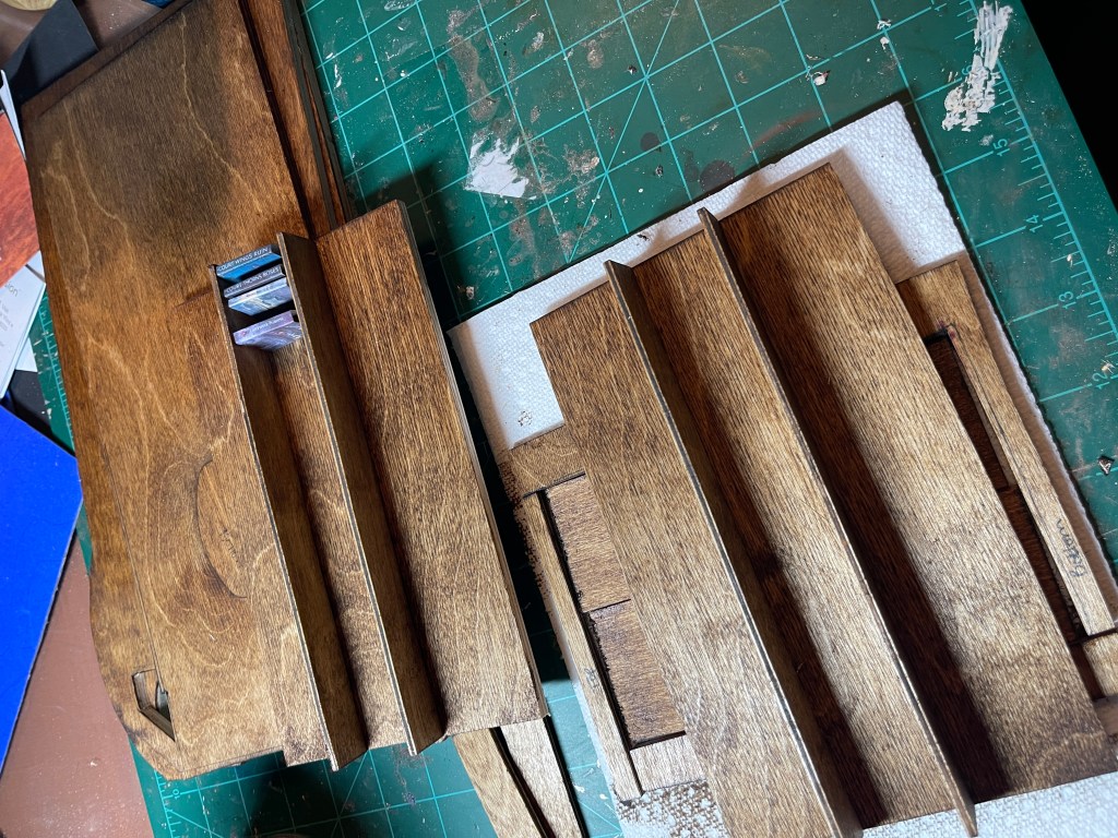 Dyeing the wood came next. I also began assembling the bookshelves. I own many books. I took a hardback, measured it, and scaled it down to 1/9th scale. I made a few dummy books to make sure they would fit on the shelves.