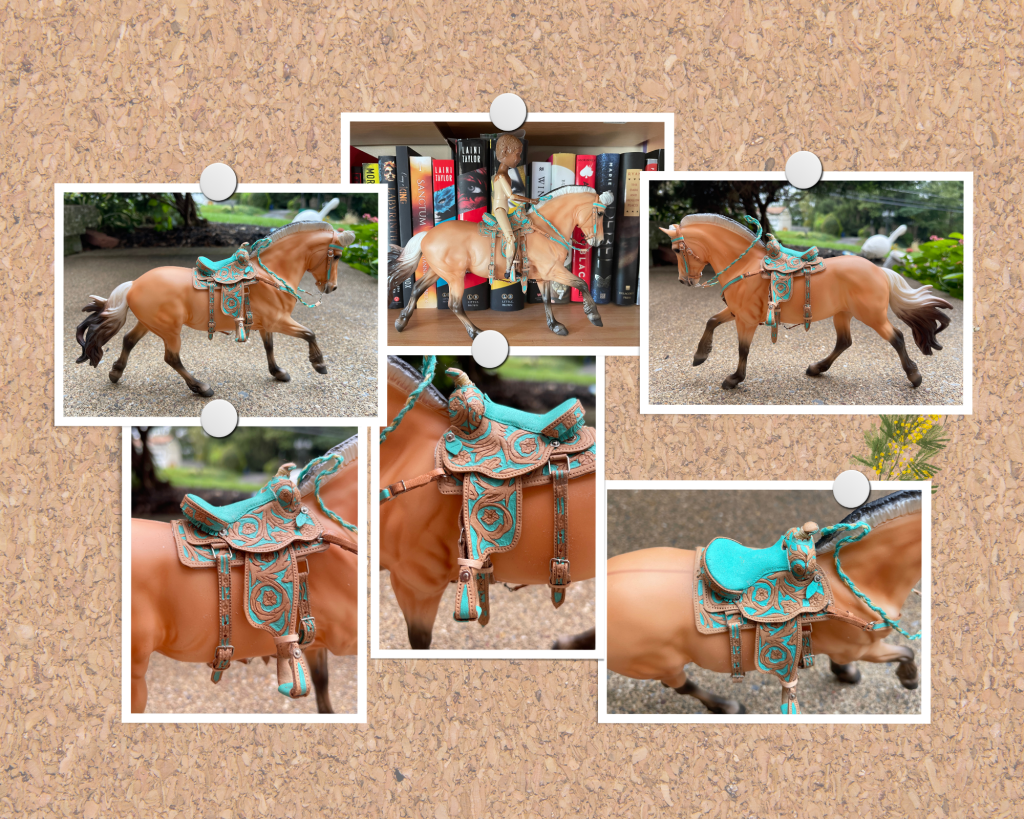 I also made a breast collar and bridle. I put together the final pieces and did a fit check on the model. I also tried a doll to make sure it’d sit too.