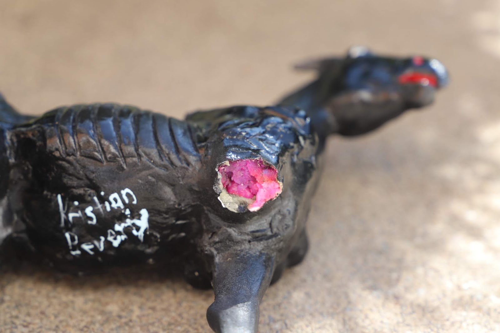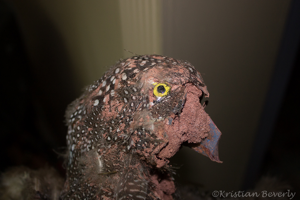 Time hasn’t been kind to him. I have zero idea about where his other front leg is. For real. No idea. He had wings at some point, but they broke off too and have been lost. I made them out of chopsticks and fabric. I spray painted it all.