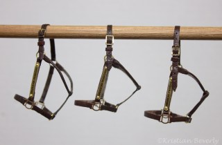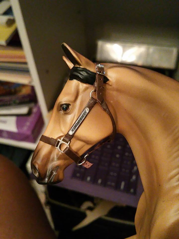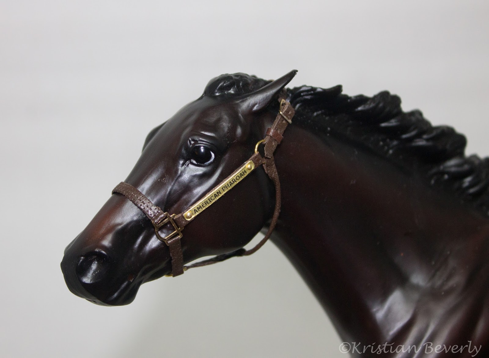 They’re all made to look like the one that the real American Pharaoh wears. The leather is dark brown/brandy with gold hardware. Each halter has a nameplate with American Pharoah’s name along with a working buckle. They’re made to fit Breyer’s Ruffian mold/American Pharaoh but should fit similarly sized models.