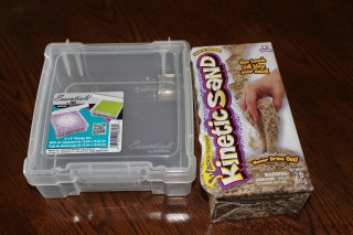 Kinetic sand is the new moon sand. I don’t have a clear memory of playing with moon sand but for the past couple of months, Michaels has been tempting me with the sand by having it right at checkout. And they had it open so that you could play with it.