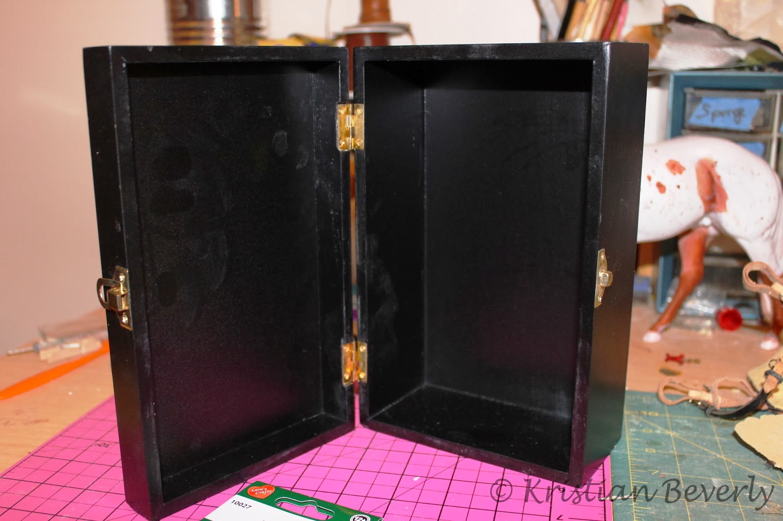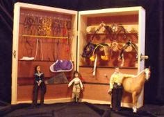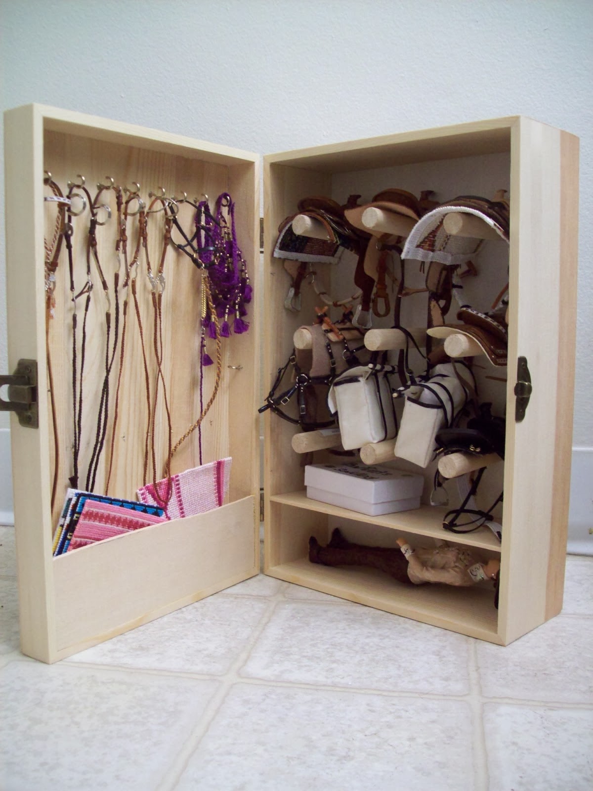 It has four hooks for four bridles or halters. There’s space for two saddles, English or Western sized. Native American or Arab sized costumes will not fit. The bottom has space for saddle pads. While it isn’t large by any means, it is a great start. And it was alot of fun to make.