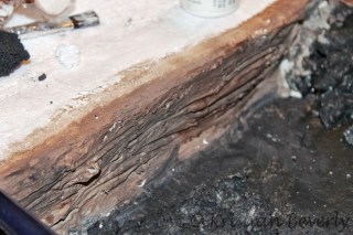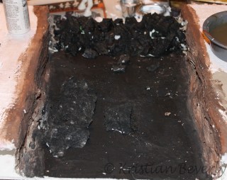 I painted the inside of the bank and the bottom of the river. I used browns such as Burnt Umber, Raw Sienna and other colors you use to paint model horses. Dry brushing seems to be a pretty popular way to paint rocks, but instead, I just watered down the paints and blended them together. Then I used black to base coat everything on the bottom since I’m using sand to cover it.