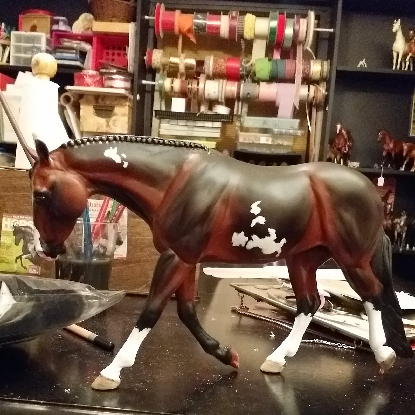 He’s a large and chunky model that lives a double life as a magnet. He has two magnets in his hooves so whenever I drop things, I use him to pick them up! My plan is to find someone to paint him so that he can be a show model instead!