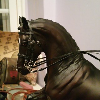 Afterwards I finished reading a ton poems for the campus literary magazine, so no plastic pony stuff for today. So here’s one of the nameplate halters I made being modeled on the owner’s model. It looks really nice. 🙂